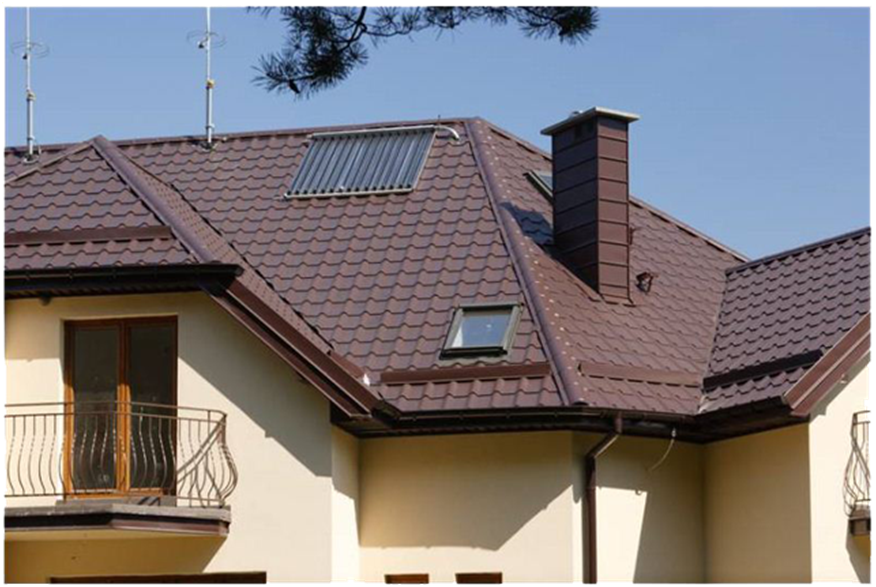 Крыша из металлочерепицы экономична, имеет доступную цену, ее листы изготавливают по длине на заказ, в отличии от гибкой кровли она не требует сплошного основания из древесных плит, укладывается прямо на обрешетку.